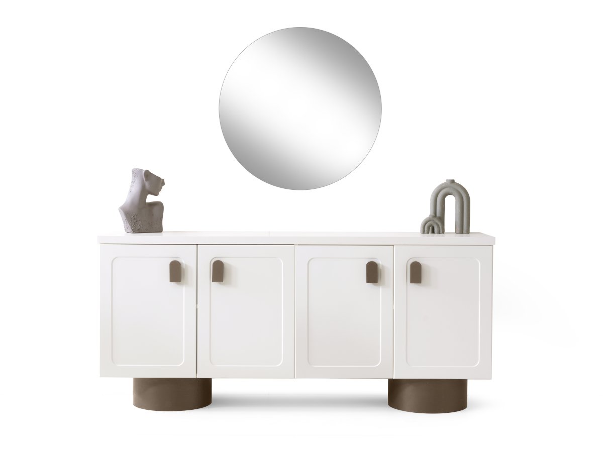 Takımın konsol bölümünde kullanılan yalın kapak tasarımı, dengeli form yapısı ve modern yüzey anlayışı ürüne zamansız bir karakter kazandırır. Yuvarlak ayna ile tamamlanan bu görünüm, yemek alanında daha ferah, düzenli ve bütünlüklü bir atmosfer oluşturur.