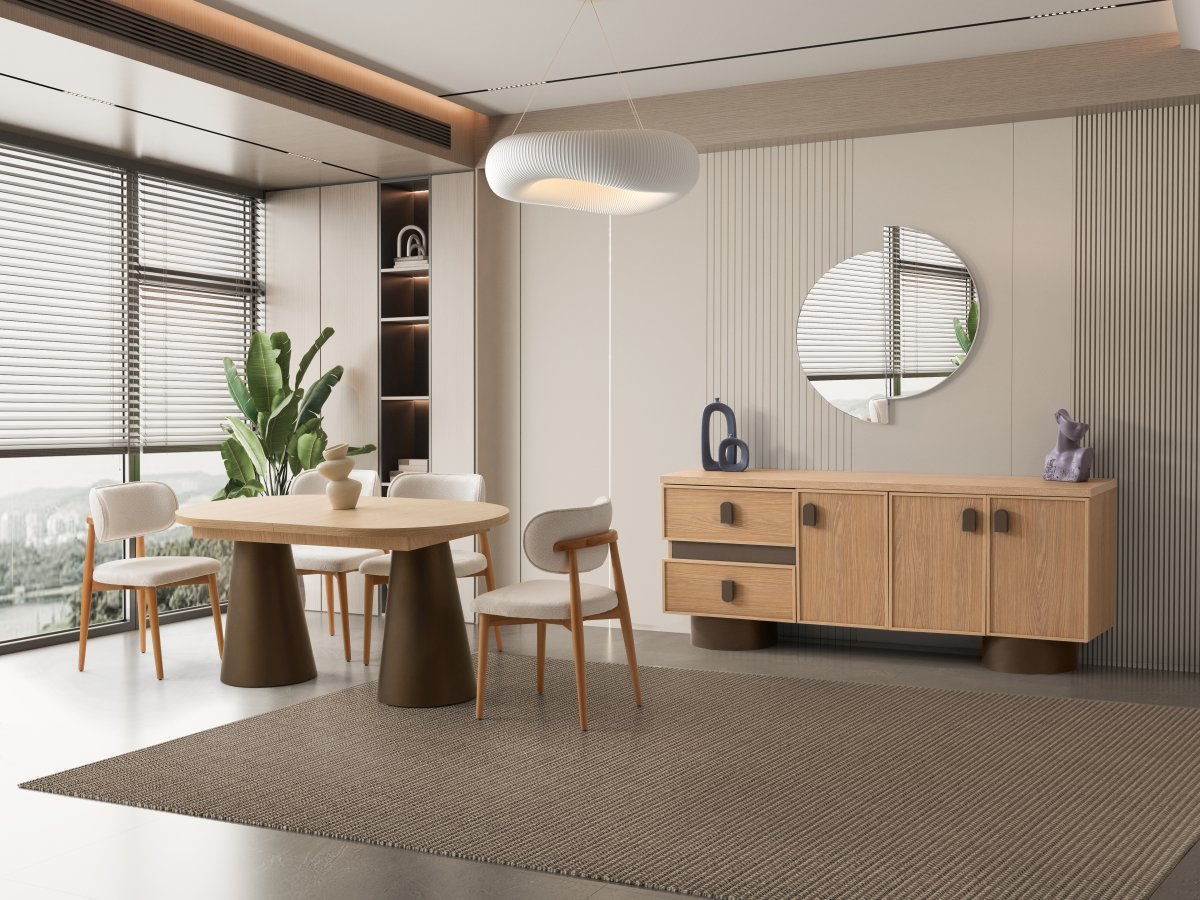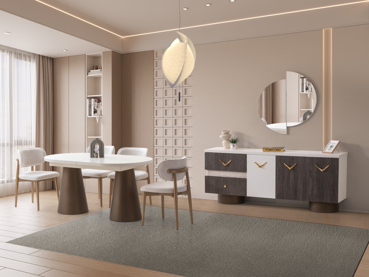 Yumuşak hatları, dengeli renk geçişleri ve sade tasarım diliyle MUME Himalaya Yemek Odası Takımı yemek alanlarına modern ve zarif bir atmosfer kazandırır. Şık masa formu, estetik konsolu ve uyumlu detaylarıyla hem günlük kullanım hem de misafir ağırlama için ideal bir seçim sunar.