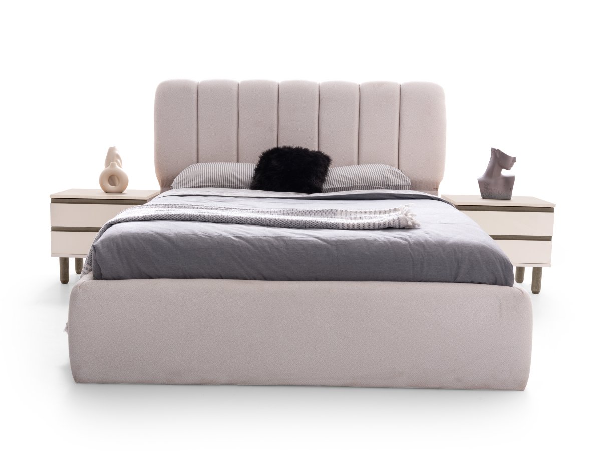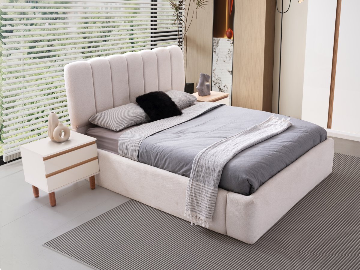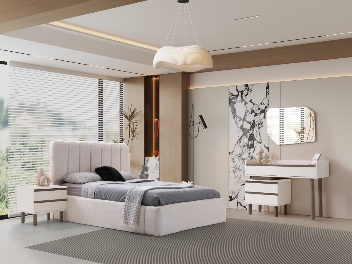 Dayanıklı MDF gövdesi, estetik başlık tasarımı ve geniş depolama alanına sahip dolap sistemi ile hem fonksiyonel hem de zarif bir yatak odası deneyimi sunar.