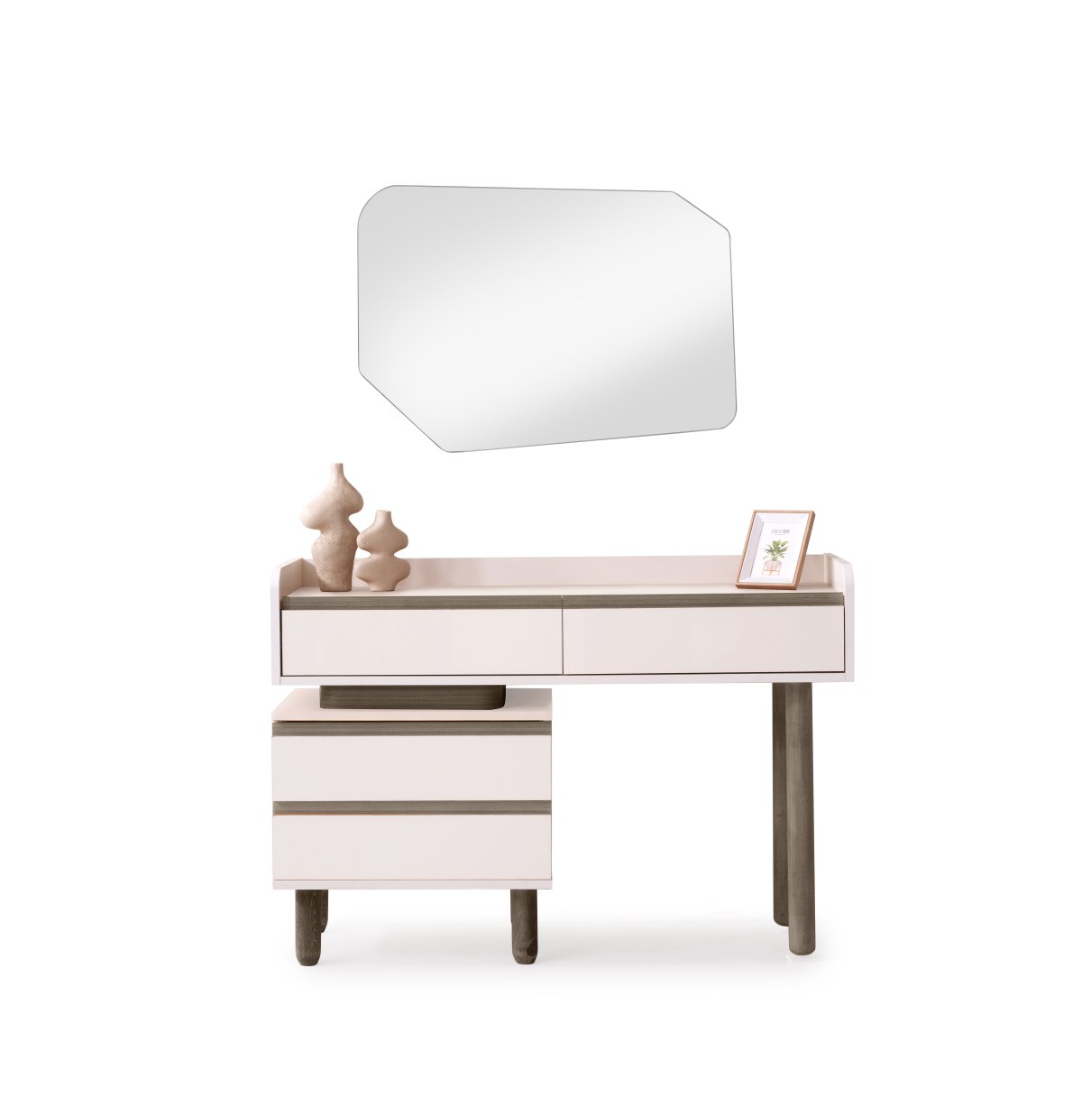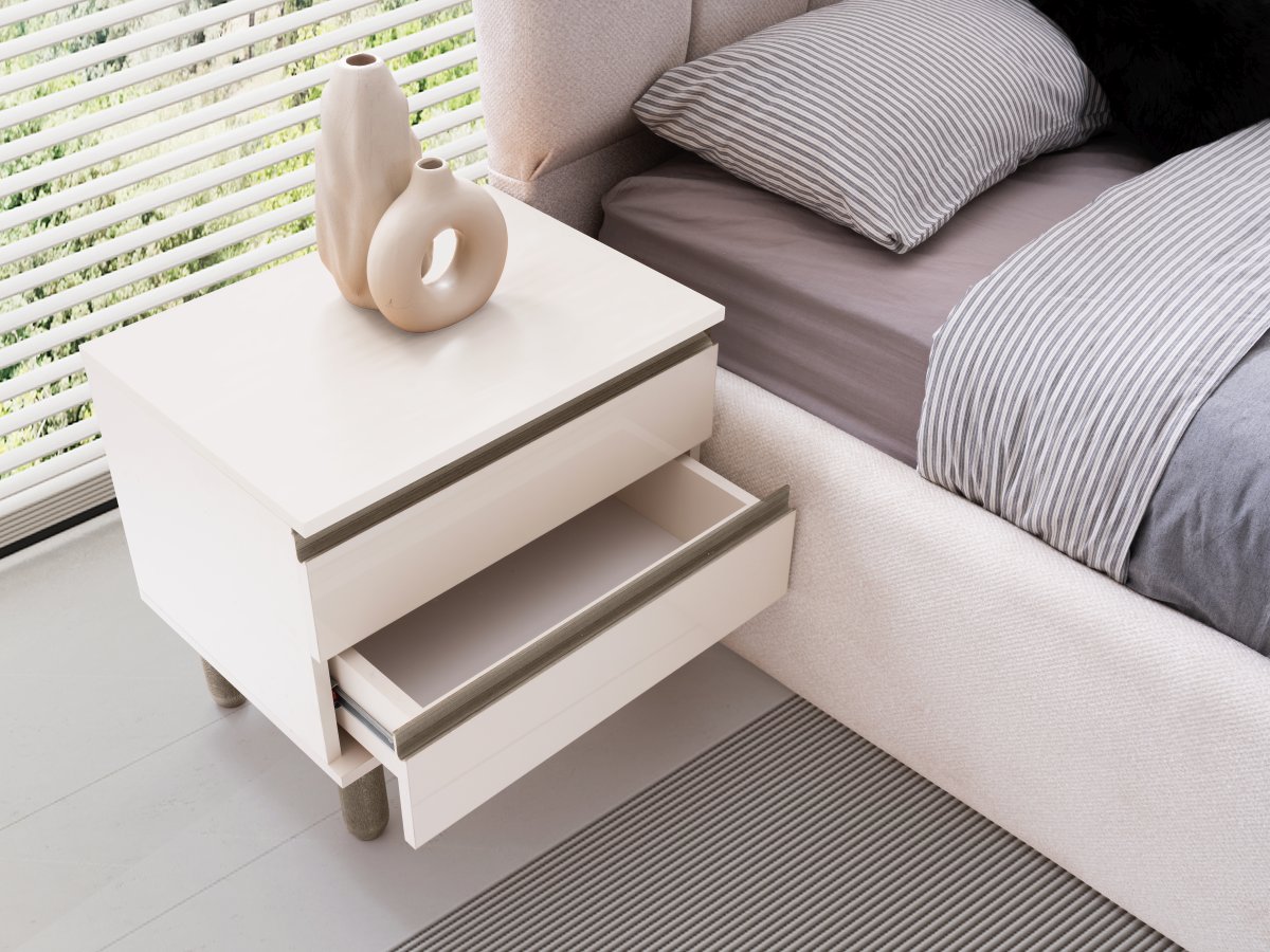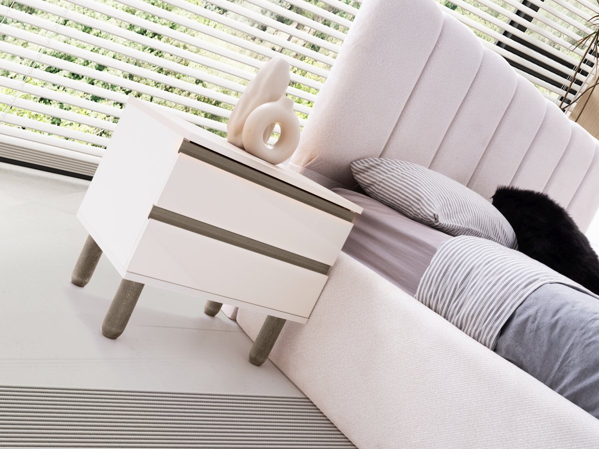 Adonis Yatak Odası Takımı, aytaşı tonunun ferahlığını Akra Meşe’nin derin dokusuyla birleştirir. Dengeli renk geçişleri ve özel form metal kulplar sayesinde mekânda dikkat çeken ama yormayan bir bütünlük oluşturur.