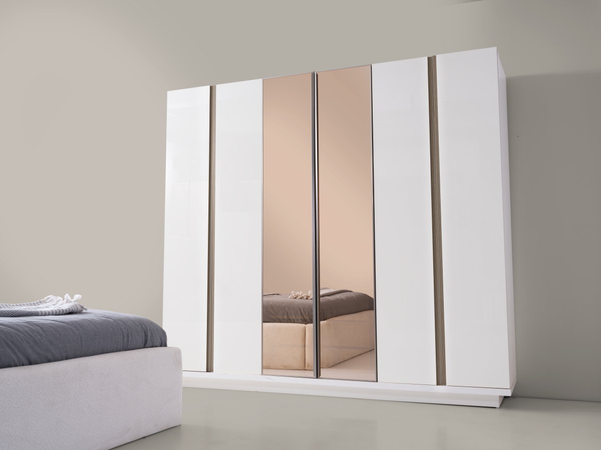 Geniş hacimli gardırop sistemi sayesinde kıyafetlerinizi düzenli şekilde yerleştirebilir, şifonyer ve komodinlerle günlük kullanım alanınızı pratik hale getirebilirsiniz. Bazalı karyola yapısı ise ekstra depolama alanı sunarak yatak odasında düzen sağlar.